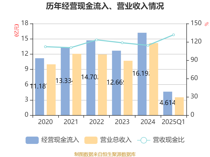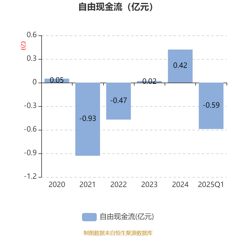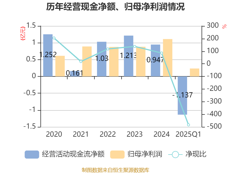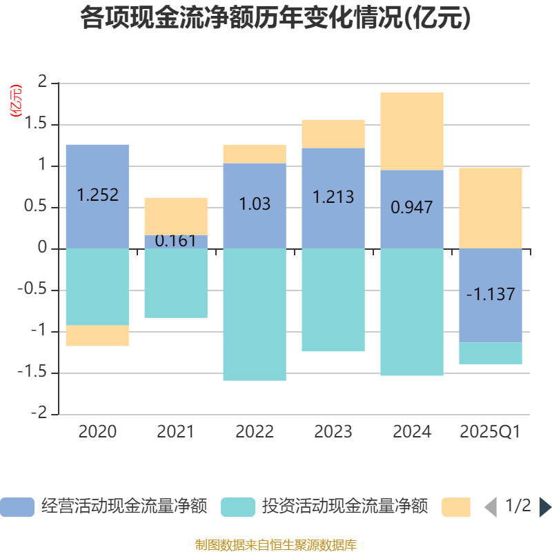 截至2025年一季度末,公司经营活动现金流净额为-1.14亿元,同比减少8066.27万元;筹资活动现金流净额9734.53万元,同比增加2976.25万元;投资活动现金流净额-2629.7万元,上年同期为-3935.72万元。
